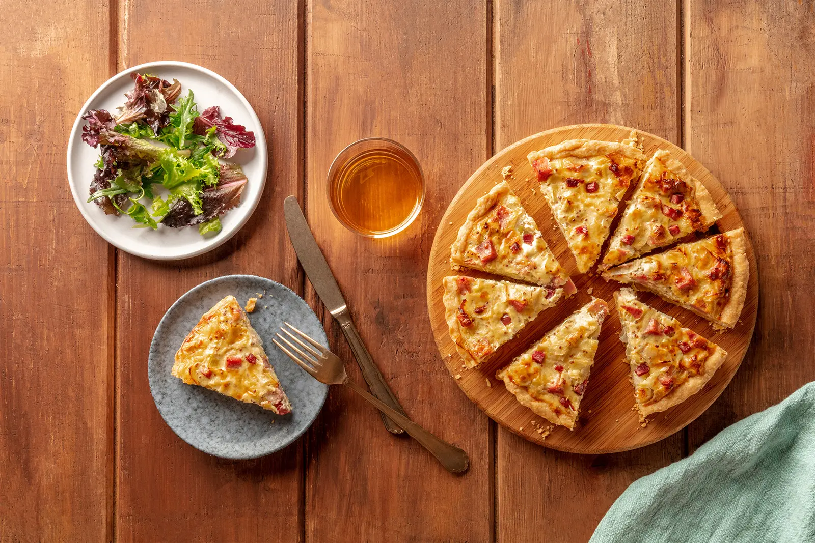 Mit hausgemachtem Kartoffel-Weißweinessig-Dressing, dazu eine Scheibe Brot